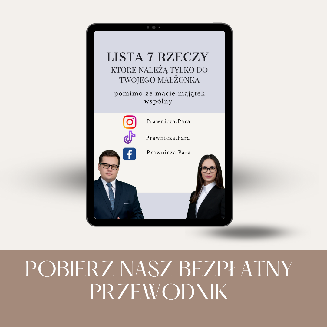 Cześć😀! Z tej strony Prawnicza Para ! Cieszymy się, że śledzisz nasze codzienne prawnicze ciekawostki. Specjalnie dla Ciebie przygotowaliśmy darmowy przewodnik, dzięki któremu poznasz, jakie konkretne składniki majątku są własnością Twojego męża lub żony, pomimo że w Waszym małżeństwie panuje ustrój wspólności ustawowej małżeńskiej (majątek wspólny). Po wypełnieniu ankiety otrzymasz automatycznie link na swój adres e-mail, skąd możliwe będzie pobranie naszego Bezpłatnego Przewodnika. Jeśli link do Ciebie nie dotarł (wcześniej jednak sprawdź foldery spam/oferty/inne) napisz - kontakt@prawniczapara.pl